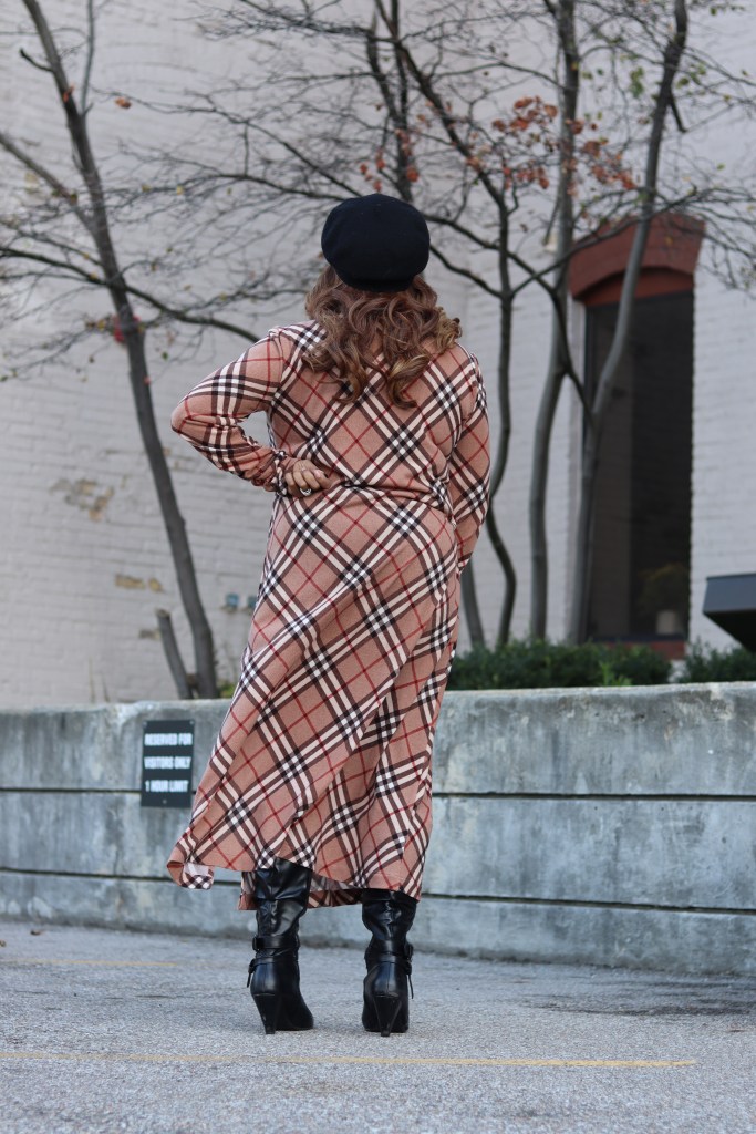 Pairings:. I paired my dress with my black leather boots, my black clutch purse and my gold hoops!