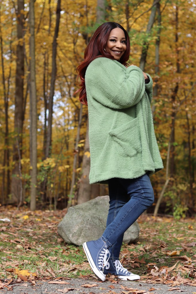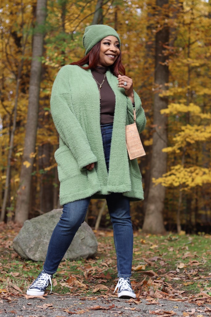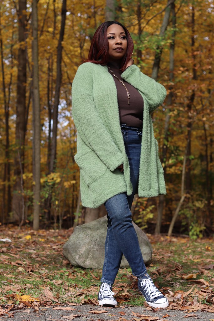 Pairings:. I paired my sweater with my skinny jeans and a brown turtleneck (both ready to wear), with my blue Chuck Taylor shoes, along with my long gold necklace and earrings. Wristlet made by me.