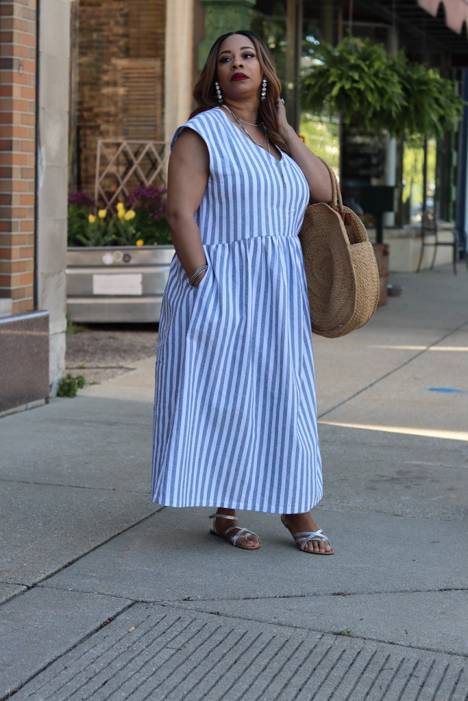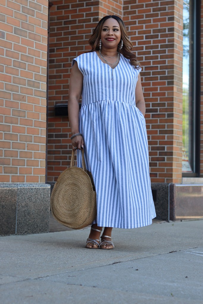 This dress really surprised me because of how great it turned out and how good it looks on! There are so many features that I love about this dress and how it wears. Some of those features includes the gathers at the waist, the drop waist line, the curve of the waist line, the pockets and the length! I made this dress in collaboration with my beautiful friend, Martika of Martika J. Makes. We both made Youtube videos about our dresses where you can see movement. You can find my video here, and you can find her video here. For my fabric, I used 100% linen that I purchased from Hobby Lobby. This fabric wears really well and it gives the dress structure and great drape as well!