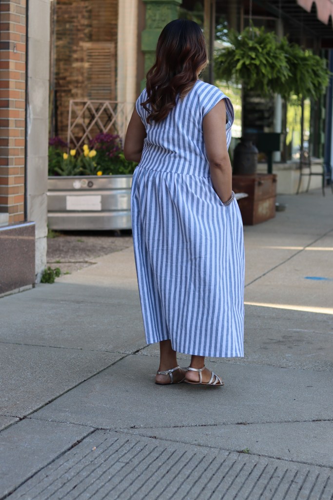 What did you particularly like about the pattern? I like the style of the dress, the length, the curved dropped waist, the gathers, and pockets.